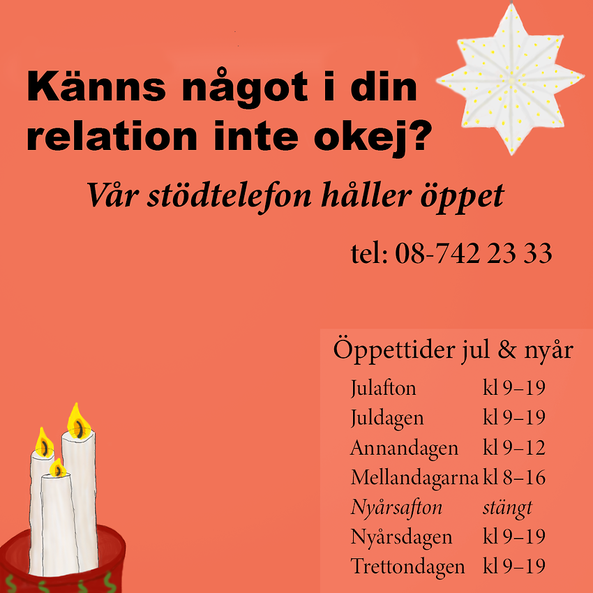 Vår stödtelefon håller öppet över jul och nyår. Till Tyresö kvinno- och tjejjour kan du ringa anonymt från hela landet. Vårt telefonnummer är 08-742 23 33. Allt du berättar stannar hos oss.